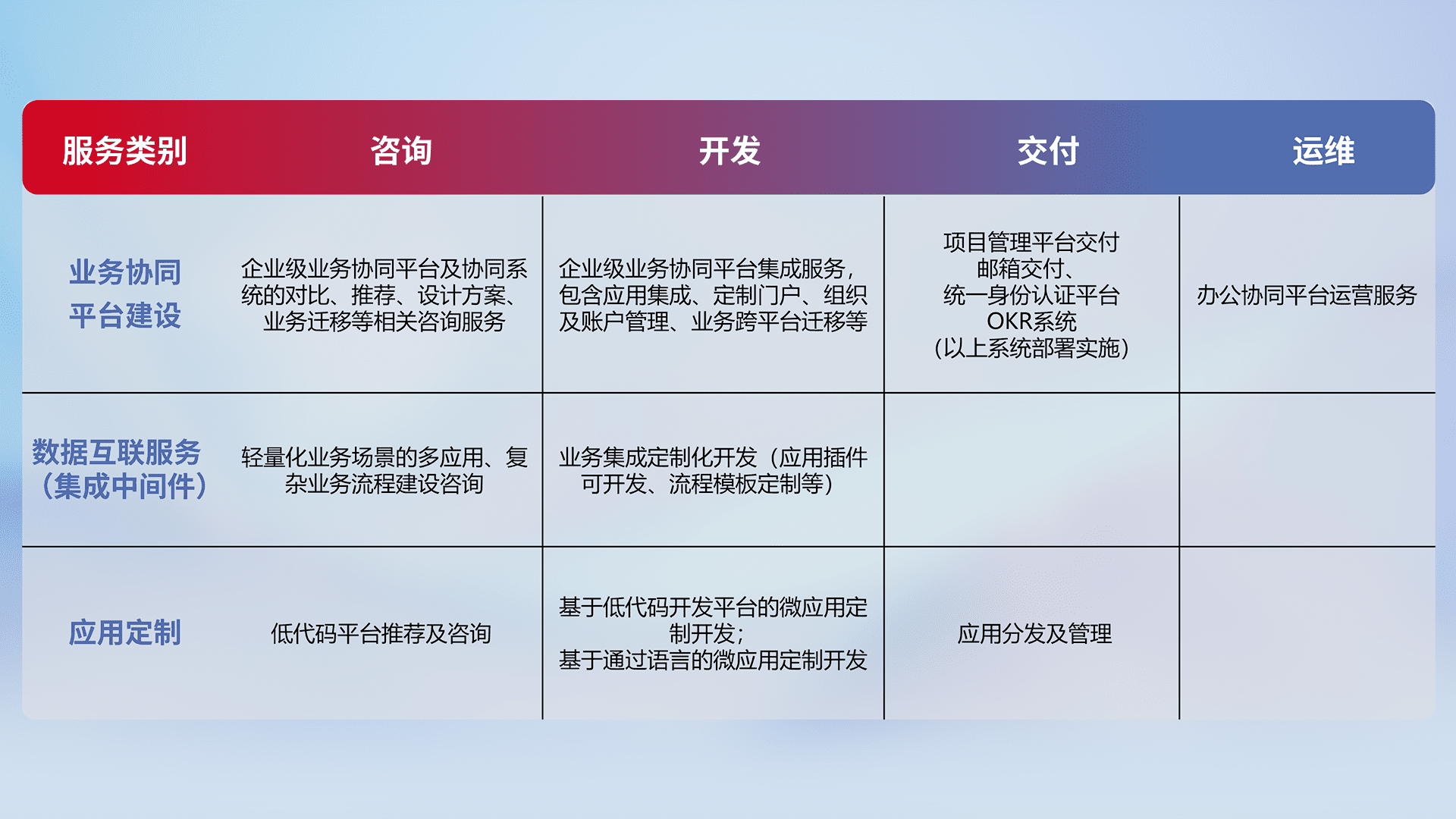针对钉钉、、企微、、IDaas等平台级产品提供产品的规划、、方案、、、、交付、、、、定制化开发等服务,,,实现如统一协同办公、、、智能客户服务、、、混合会议管理、、、智能数据查询、、、等业务场景,,实现数字化转型。。。