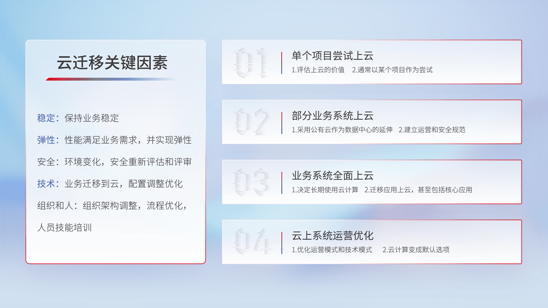 结合实际业务,,,,从规划设计、、、、云平台选型、、、云原生改造、、、、数据迁移、、、集成交付,,迁移全过程为客户识别最佳上云路径,,做好风险识别管理,,设计网络架构、、身份权限、、安全审计合规、、操作审计、、、日志审计、、、、监控告警策略、、、多站点容灾设计等,,,,对云上基础设施进行整体规划,,,提升IT治理水平,,,,以满足弹性、、高可用、、、高性能的需求。。。