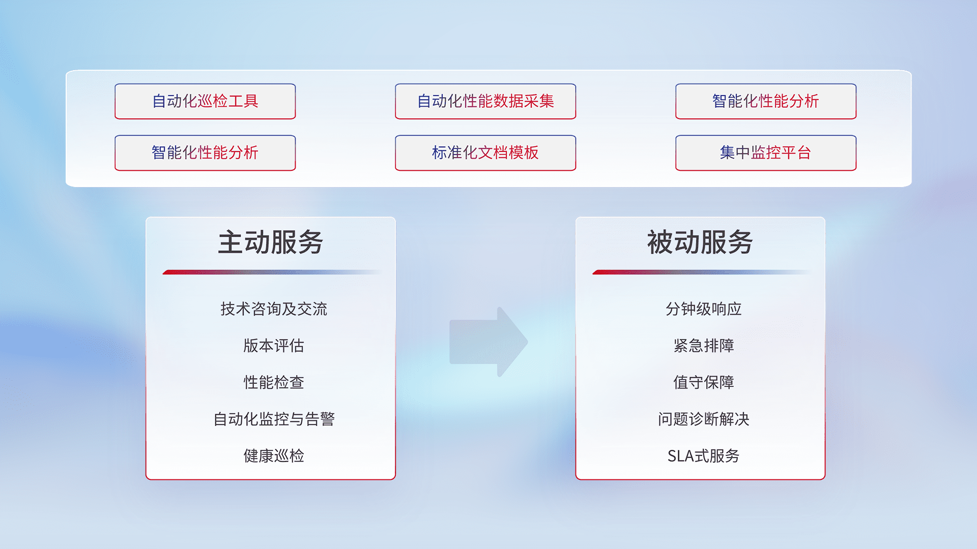 智能化工具和标准化文档,,,保障服务质量,,,提供主动服务(包含技术咨询、、、、版本评估、、性能检查、、、、自动化监控与告警、、、健康巡检)和被动服务包含(分钟级响应、、、、紧急排障、、、值守保障、、、、问题诊断解决、、SLA服务)。。。。